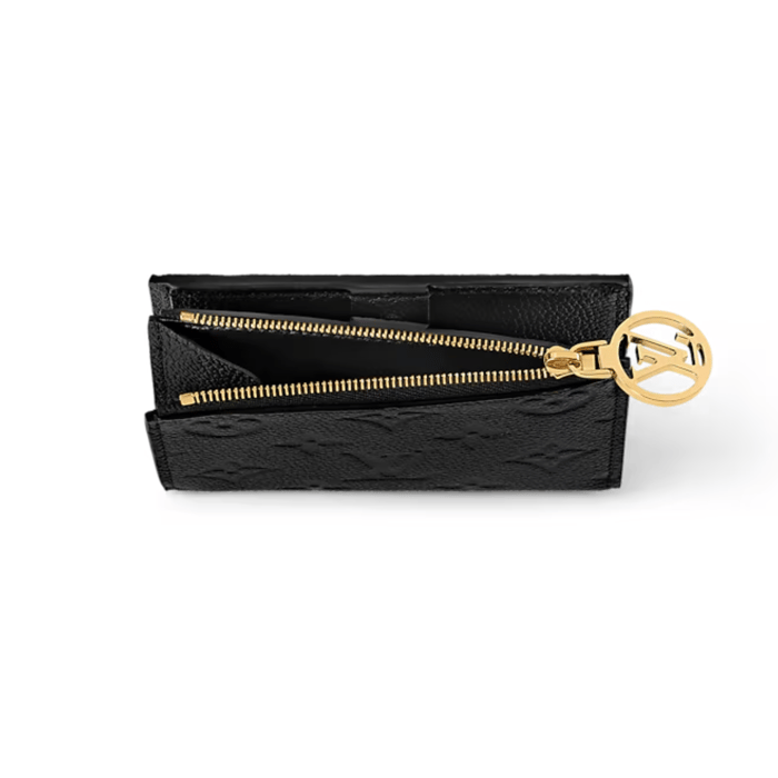 The compact Lisa wallet is reinterpreted in supple Monogram Empreinte leather, which is embossed with the Monogram pattern. This neat wallet is notable for its gusseted coin pocket with an LV Circle charm on the zip pull. Inside, it offers a bill compartment, two flat pockets and four card slots.