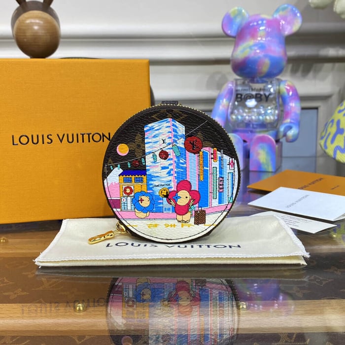 This collectible edition of the Round Coin Purse in Monogram canvas belongs to the Vivienne Holidays 2022 collection, which evokes the spirit of travel. In a tribute to Japan, an exclusive print shows Louis Vuitton mascot Vivienne in front of the Tokyo boutique, with the iconic Mount Fuji in the background. This cute, colorful accessory can be attached to a bag or belt.