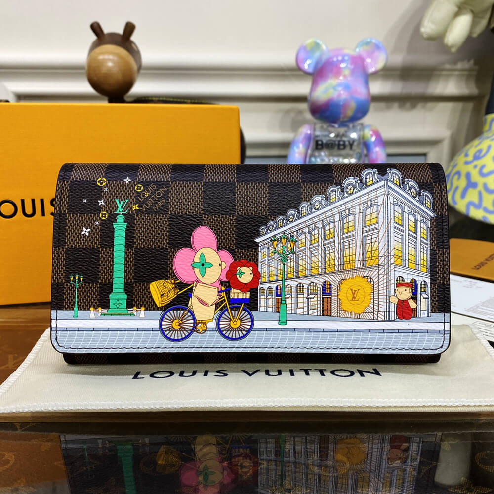The Sarah wallet in Damier Ebene canvas is revisited for the Vivienne Holidays 2022 collection, which celebrates the spirit of travel. An exclusive print pays tribute to Paris with a colorful scene featuring Louis Vuitton’s mascot Vivienne cycling past its boutique on Place Vend?me. An ideal gift, this collectible edition of this elegant flap wallet is finished with a pink leather lining.