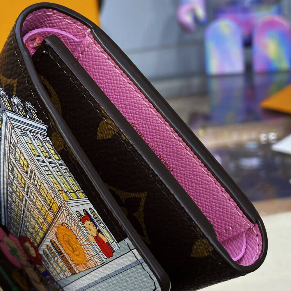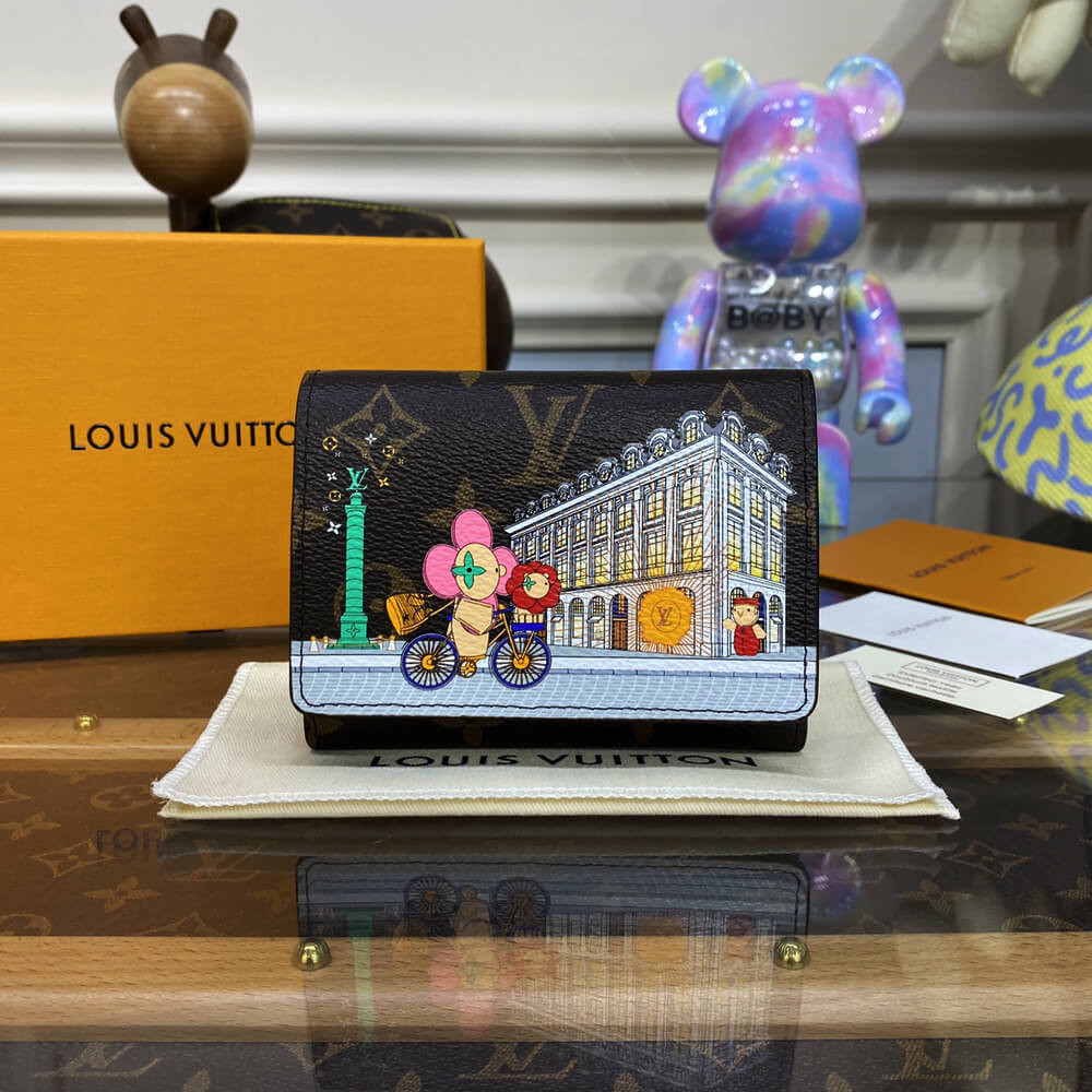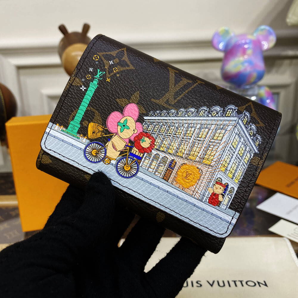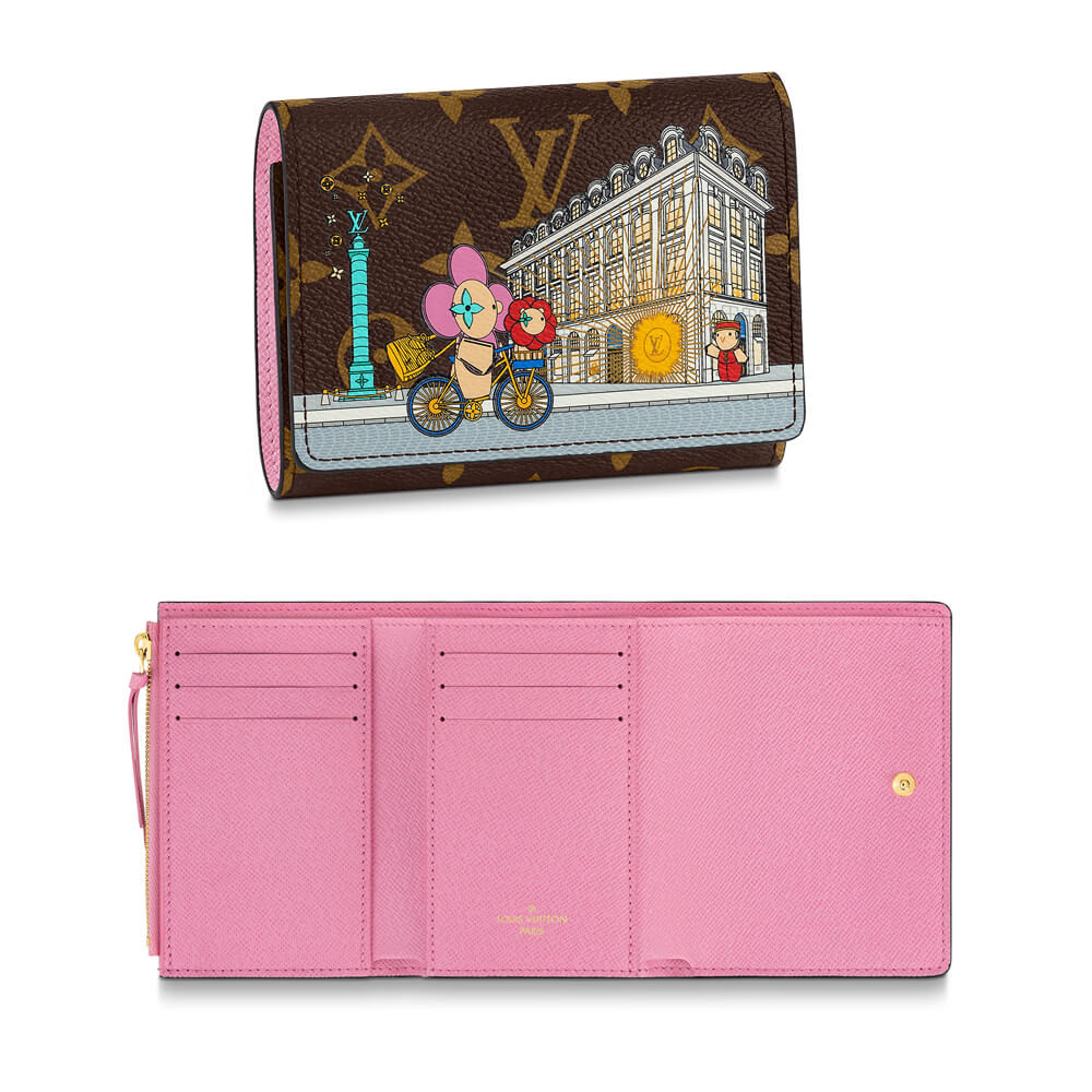For the Holiday 2022 collection, the Victorine wallet in Monogram canvas is revisited with an exclusive print celebrating the spirit of travel. It features Louis Vuitton’s Vivienne mascot cycling past its Paris boutique, with the iconic column of Place Vend?me in the background. This collectible edition of this tiny, fold-out wallet is finished with a pink leather lining.