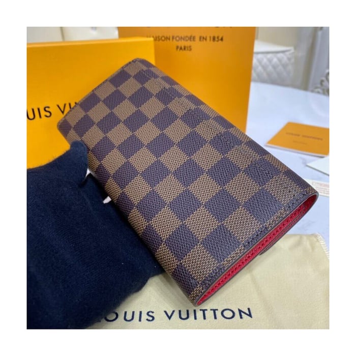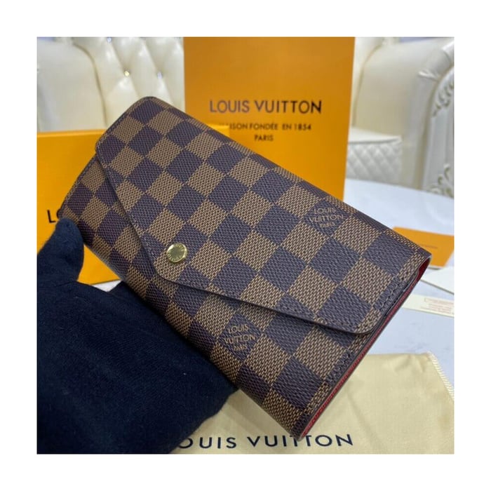 The Sarah Wallet comes in Louis Vuitton’s historic Damier Ebene canvas, complemented by a grained leather lining. This classic wallet combines a feminine look with a highly functional design, including two roomy compartments, a zipped coin pocket and numerous card slots. Its envelope-style flap is sealed with an engraved, gold-tone press stud.