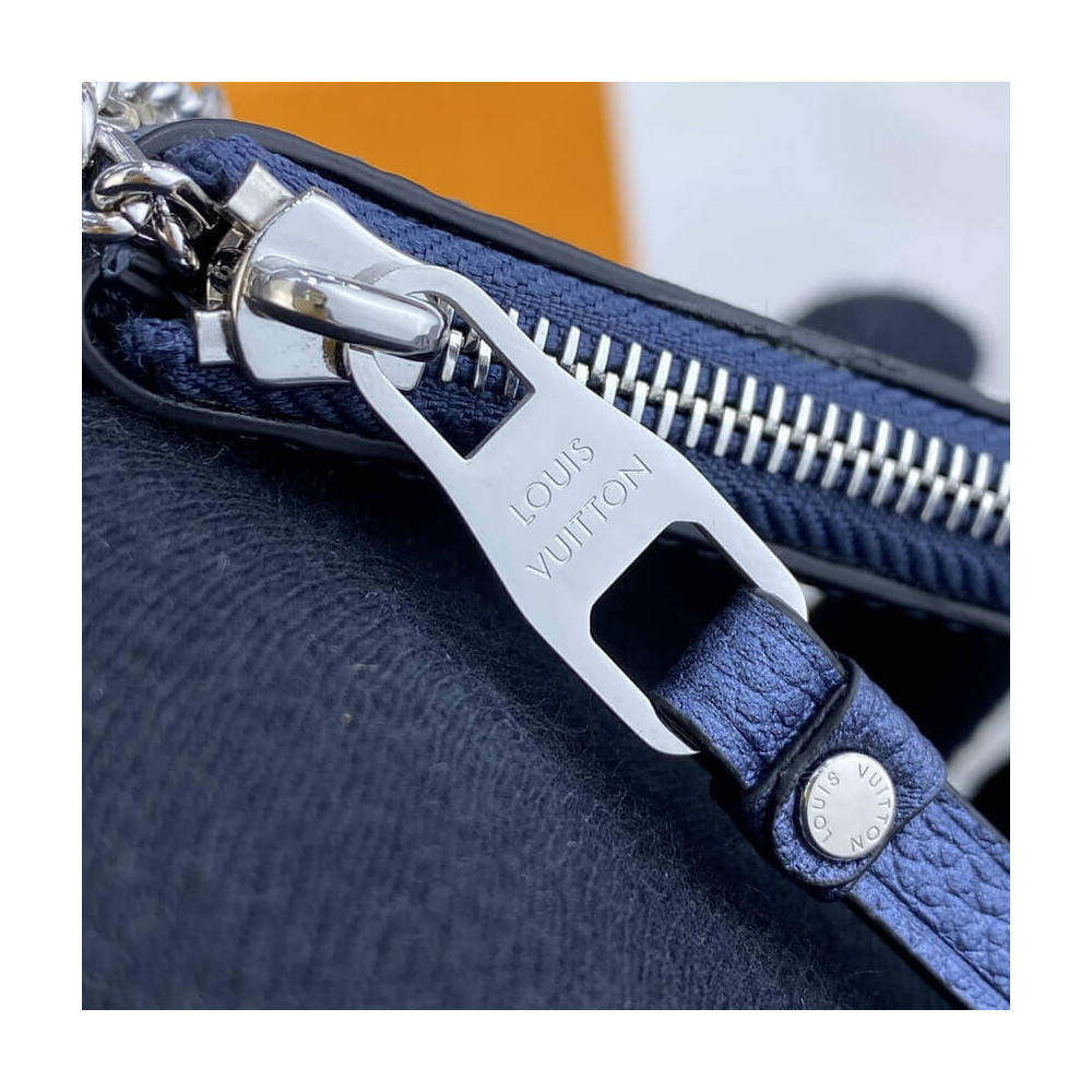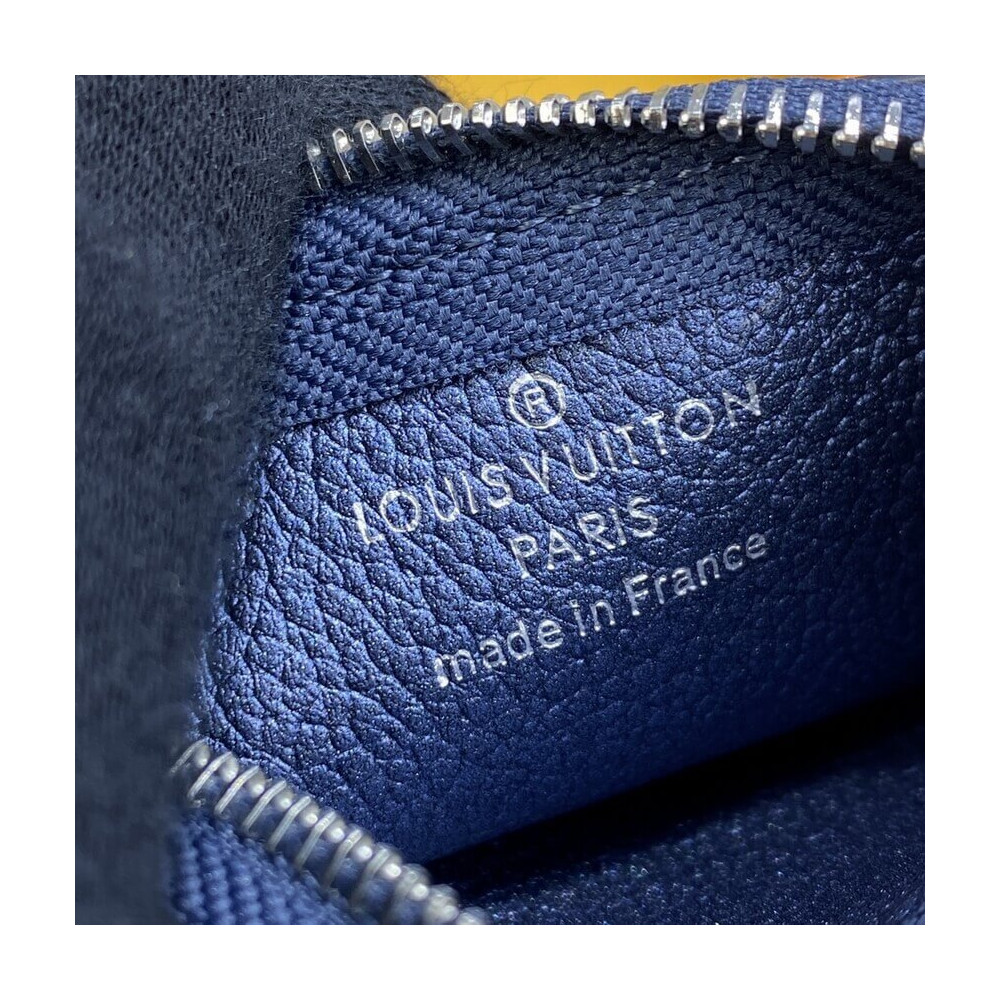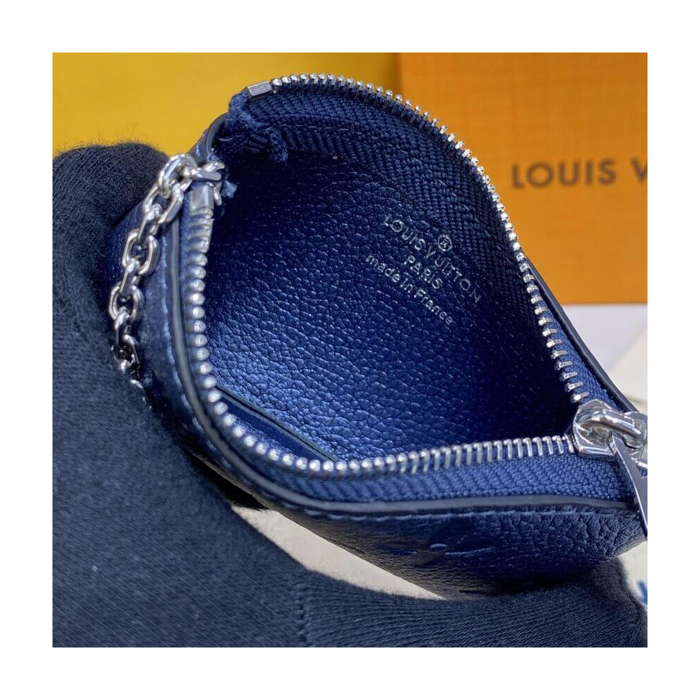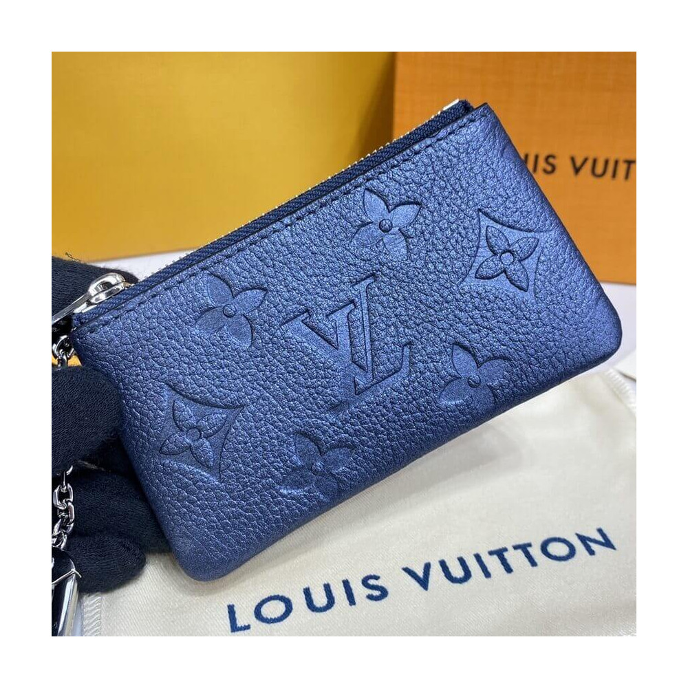 The Key Pouch is fashioned from Monogram Empreinte grained leather in a navy-blue hue. The leather has a pearly finish and is embossed with LVs and Monogram Flowers. A functional accessory, it’s lined with leather and features an inside pocket with a compartment for change.