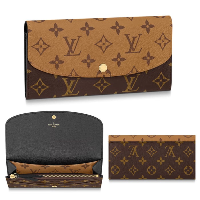 This edition of the Emilie wallet combines Monogram and Monogram Reverse canvas for a sophisticated, modern look. Distinguished by its sleek design and rounded flap, this wallet slips easily into most bags, and can even double as a clutch. Its neat interior offers many practical features, while there is an additional flat pocket at the back.